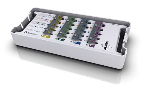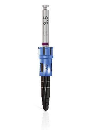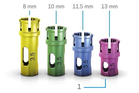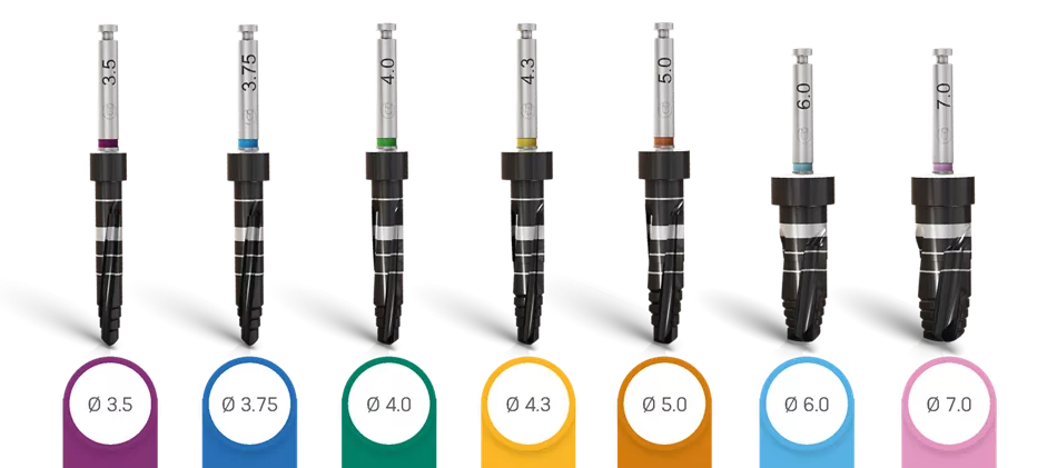 • Intuitive solution with a color code facilitating identification of the drill sequence, the diameter and length of the implant and the combination of drill stop and drill.
