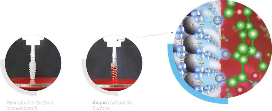 La capa de óxido de titanio sobre una superficie de implante es normalmente electronegativa. Las consecuencias de esta característica particular es reducir el contacto entre la superficie del implante y la sangre, que también es electronegativa. Los implantes de superficie hidrófila se caracterizan por la capa de electropositividad de óxido de titanio. La activación físico-química de la superficie Acqua cambia la superficie negativamente cargada a positiva, atrayendo iones de la sangre que mejoran el contacto, como han demostrado estudios in vitro.(1,3)