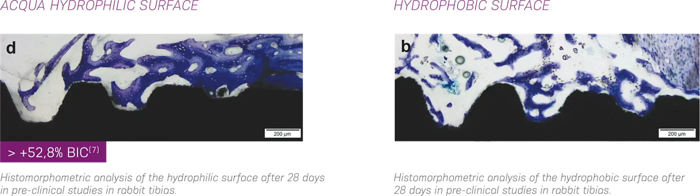 La hidrofilia produce mayor contacto entre las proteínas de la sangre y el implante, lo que hace efectivo el inicio del proceso de regeneración ósea.(4,8,9) Un estudio preclínico (7) en tibias de conejo realizado con implantes Acqua sugiere un aumento del BIC del 52,8% en 28 días