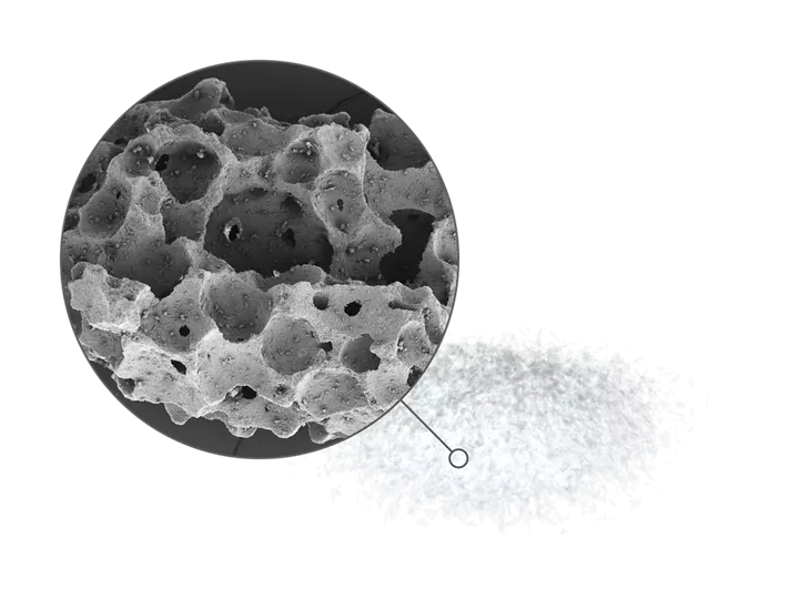 maxresorb® is not only a mixture of HA and β-TCP particles. During the production process HA and β-TCP are brought together in a ceramic slurry, which is then foamed and freeze-dried to form particles containing both phases. The fast resorption of the β-TCP component continuously increases the porosity of the material promoting tissue integration by allowing ingrowth of cells and blood vessels. 7,8