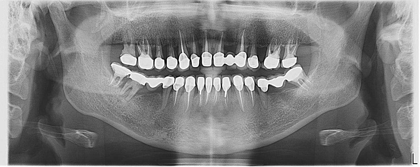 Ортопантомограмма спустя год после завершения реабилитации пациентки. (Илл. 25)