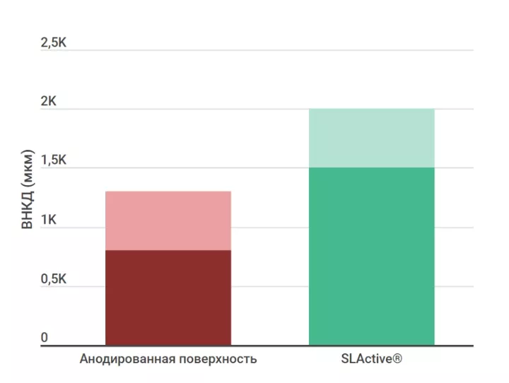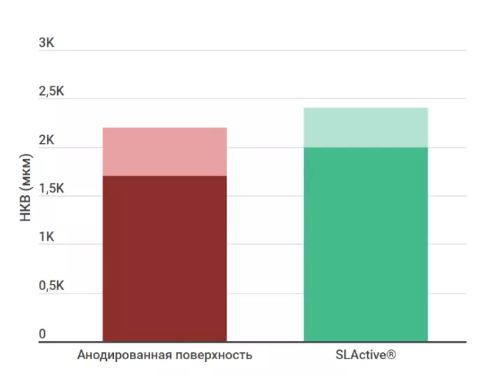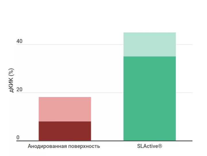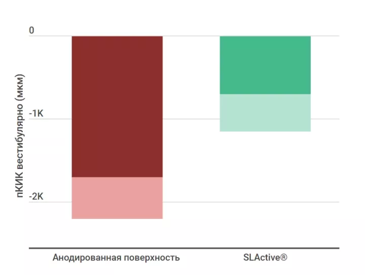 Через 8 недель заживления объем новообразованной кости в области шейки имплантата (ПКПД) был значительно выше в контрольных группах 2 и 3 по сравнению с тестовой группой 1. Анализ остальных параметров остеоинтеграции имплантата и формирования новой костной ткани (дКИК, НКВ, пКИК) дал схожие результаты, свидетельствующие о превосходстве умеренно шероховатой поверхности по сравнению с анодированной поверхностью. Показатель контакта имплантата с нативной костью в области апекса (нКИК) через 2 недели заживления был выше в группе 3, чем в группах 1 и 2. Через 8 недель заживления нКИК был значительно выше в группах 2 и 3 по сравнению с группой