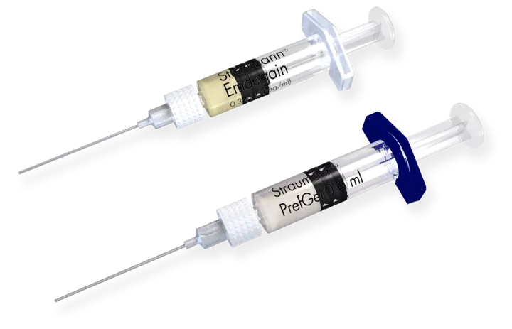 Straumann® Emdogain® is a mix of enamel matrix proteins that, when applied to a clean tooth root surface, form an extracellular matrix that stimulates cells and processes that are fundamental for periodontal regeneration1. Numerous scientific studies provide clinical evidence of the application of Straumann® Emdogain® in different indications such as periodontal regeneration and gingival recession.