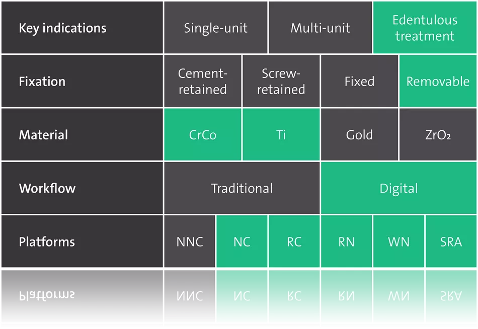 Placement on 2 to 10 interfaces, for tissue level and bone level implant platforms, or combinations. Alignment of insertion axis for highly divergent implants.